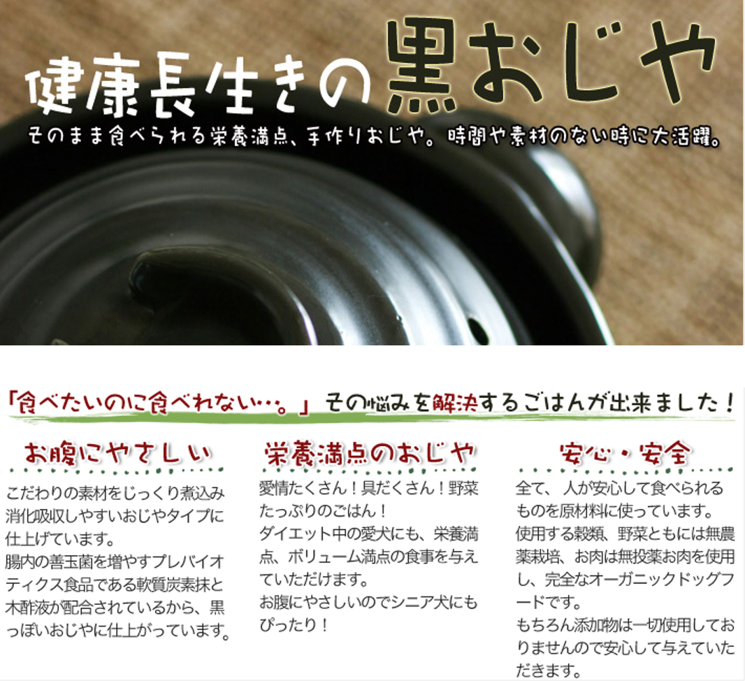 万が一わんちゃんが食べてくれなかった場合は全額返金※いたします。消化・食欲・嘔吐に配慮した、リカバリーフード『健康長生き黒おじや』をこの機会にぜひ一度お試しください。