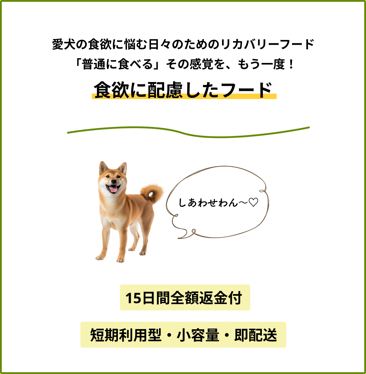 この子の“いつもの調子”を守りたい!そんな、飼い主さんの気持ちから考えた、消化のしやすさや、食べやすさに配慮して、特別に設計したリカバリーフードです。 体調が不安定な時は、“いつも通りのごはん”が負担になることもあります。 愛犬の食事時間が少しでも安心できるように、愛犬の体調が不安な時期の一時的な食事の選択肢として、リカバリーフードは大変喜ばれています。