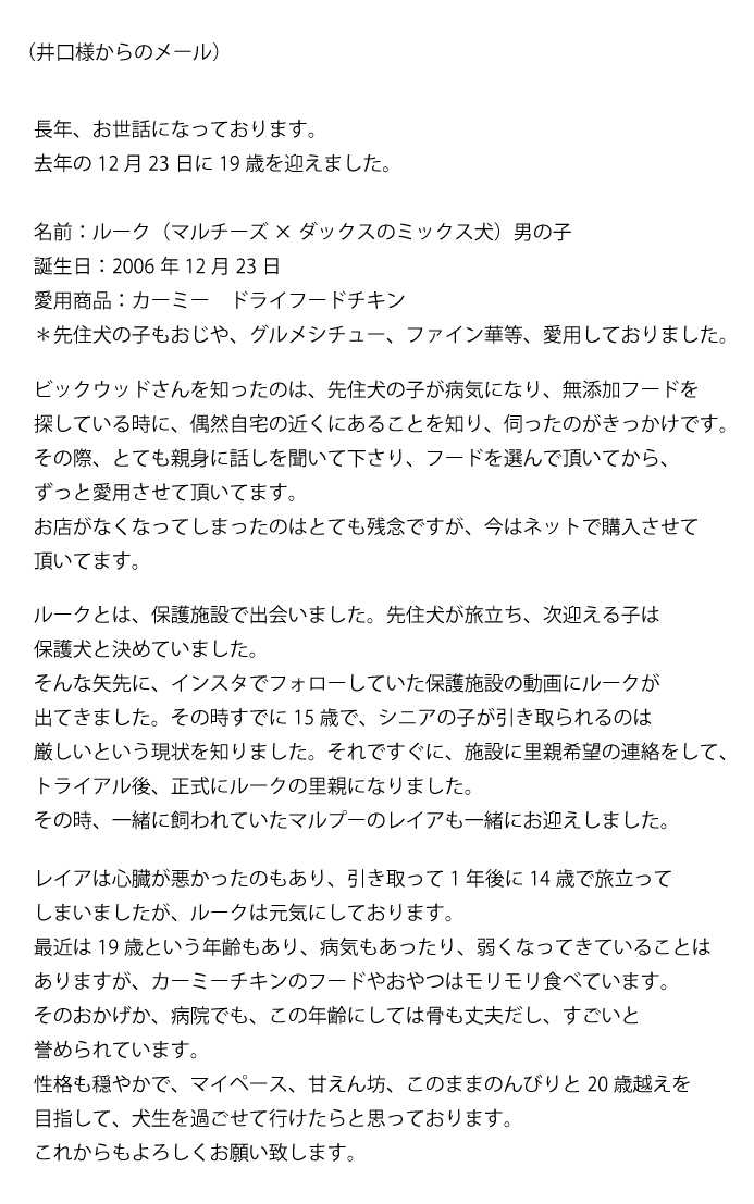 これからもビッグウッドはルーク君の健康で長生きを応援します。